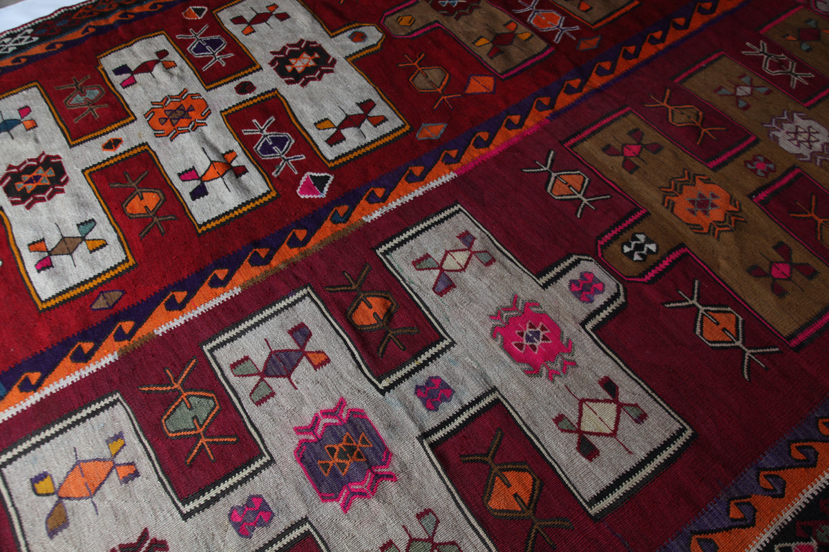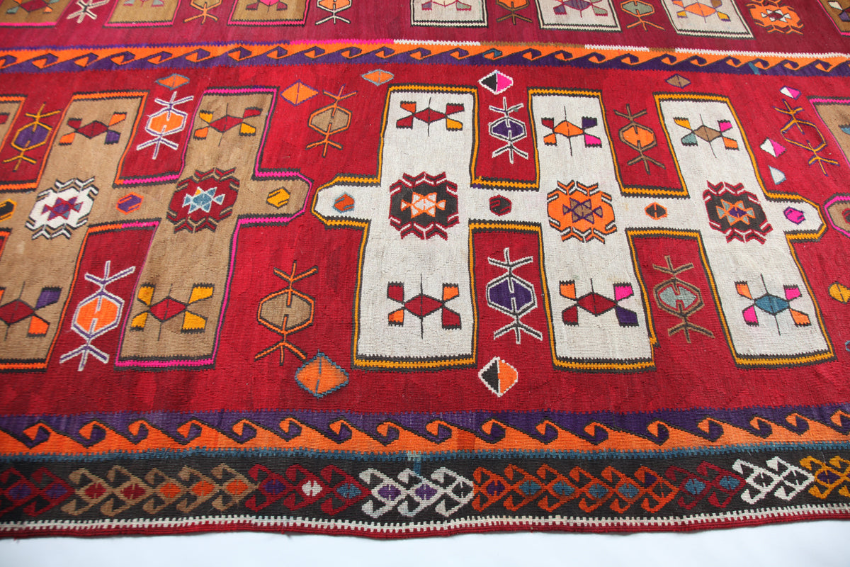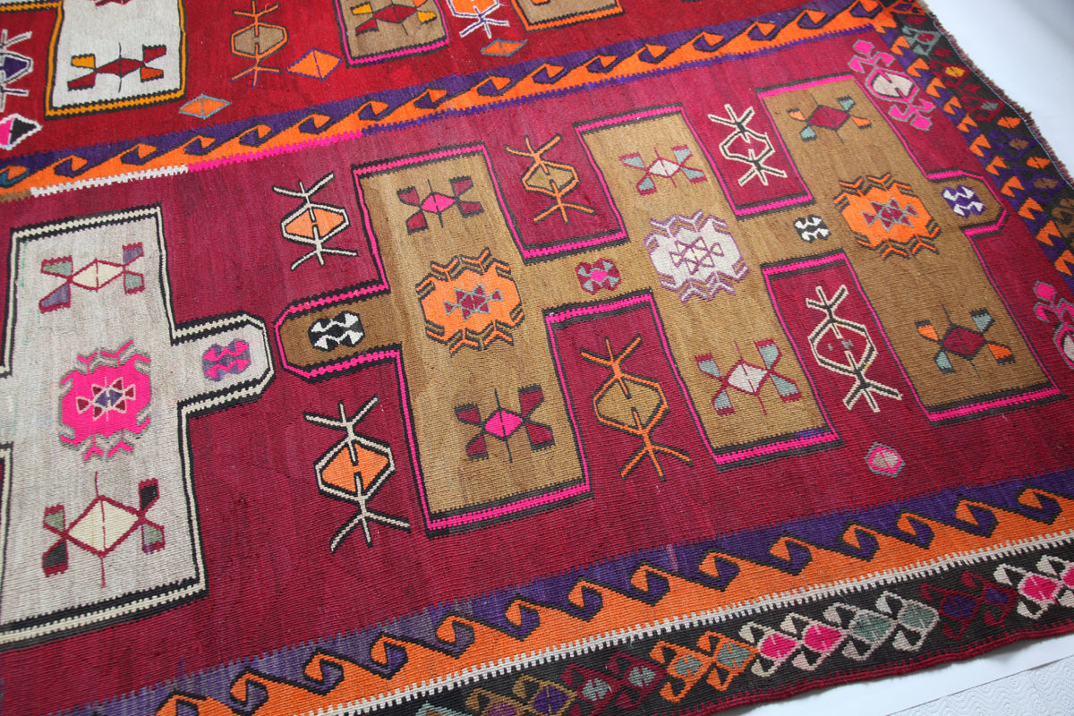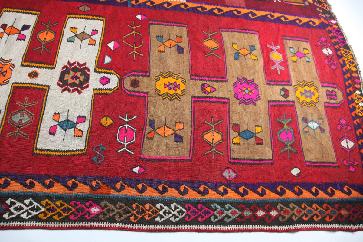 This Erzurum kilim is woven as two panels with each side being a bit different. It has very vibrant colors in reds, purple, orange and more. The small border is surrounded with dragon heads, outer border is decorated with Anatolian Goddess symbols, (hand-on-the-hips), and more of other spiritual symbols.