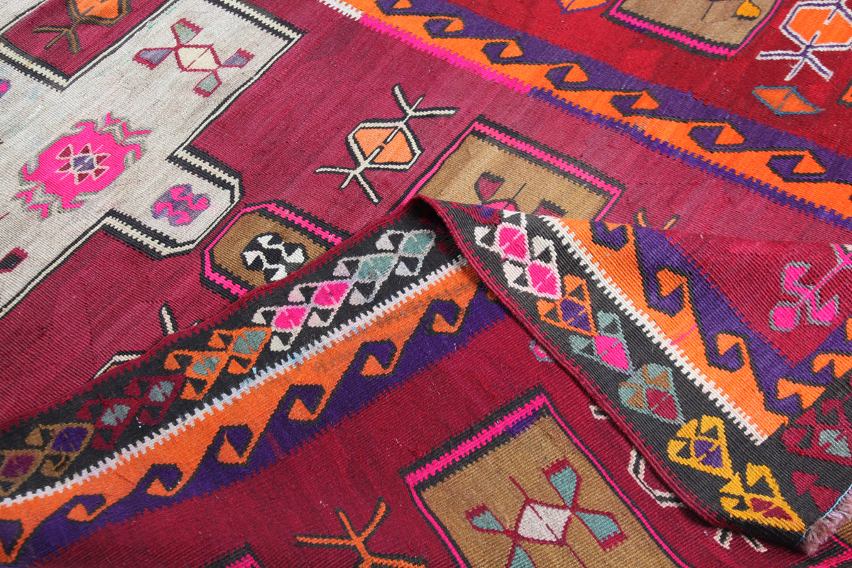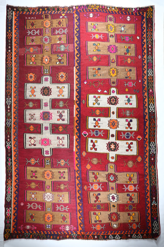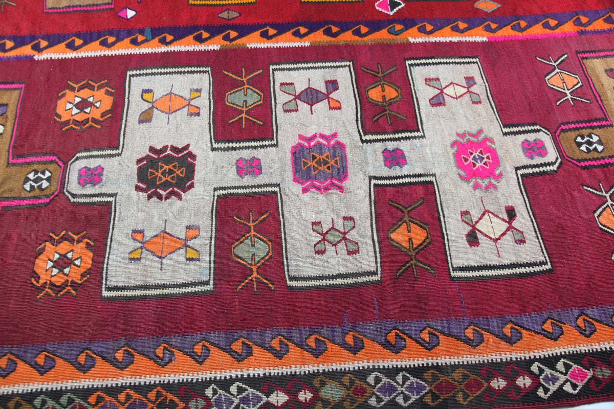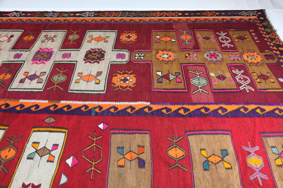 This Erzurum kilim is woven as two panels with each side being a bit different. It has very vibrant colors in reds, purple, orange and more. The small border is surrounded with dragon heads, outer border is decorated with Anatolian Goddess symbols, (hand-on-the-hips), and more of other spiritual symbols.