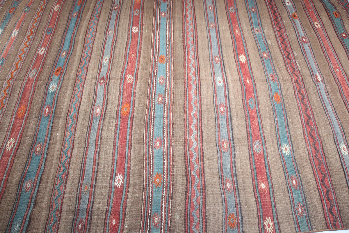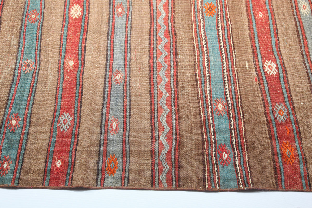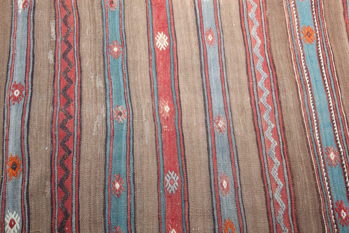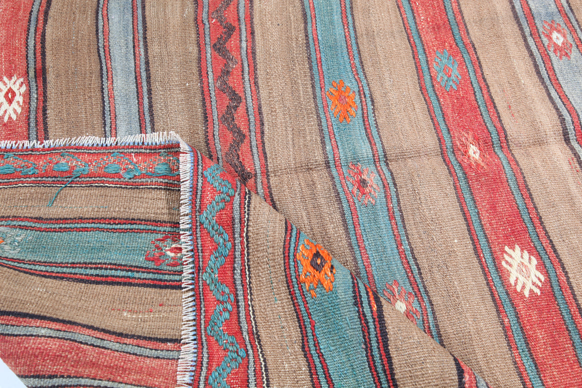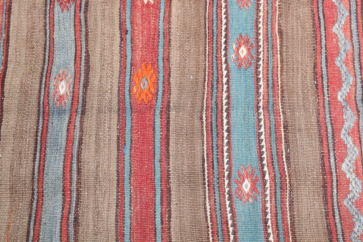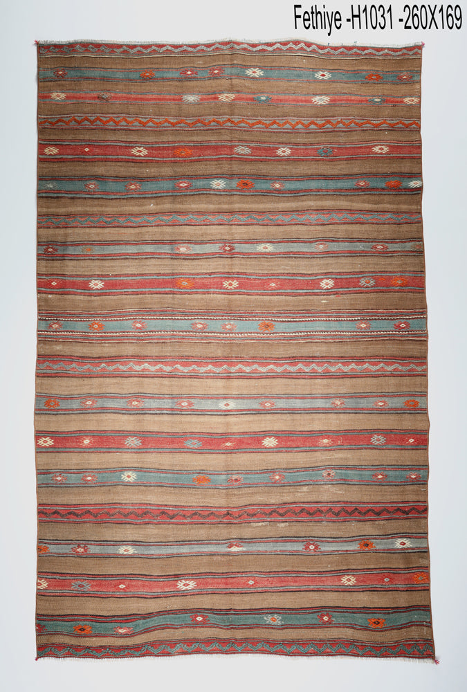 Fethiye kilims are a type of handwoven rug originating from the Balikkesir region in northwest Anatolia, Turkey. These rugs are deeply connected to the nomadic customs of the Yüncü people. The first documented Turkish kilim can be traced back to Neolithic pottery from Çatalhöyük, dating back to 7000 BC. Originally used as blankets, saddle blankets, seat mats, or wall decorations, kilims with varied purposes, such as this one, were often created with striped patterns, known as "water channel" or "essence of life."