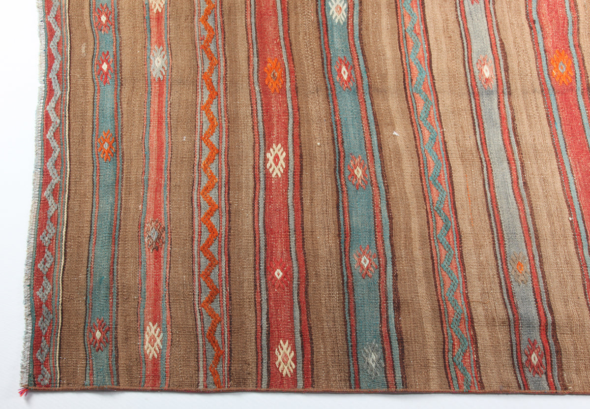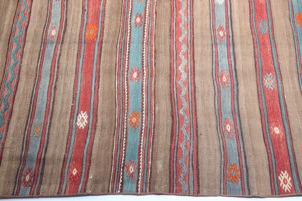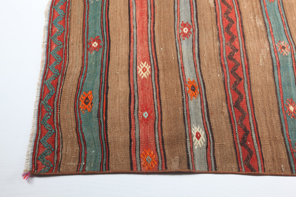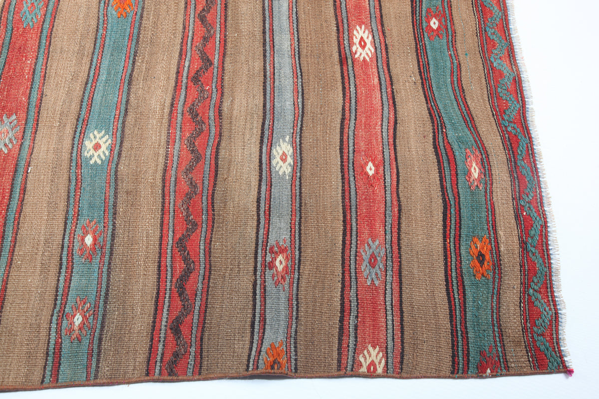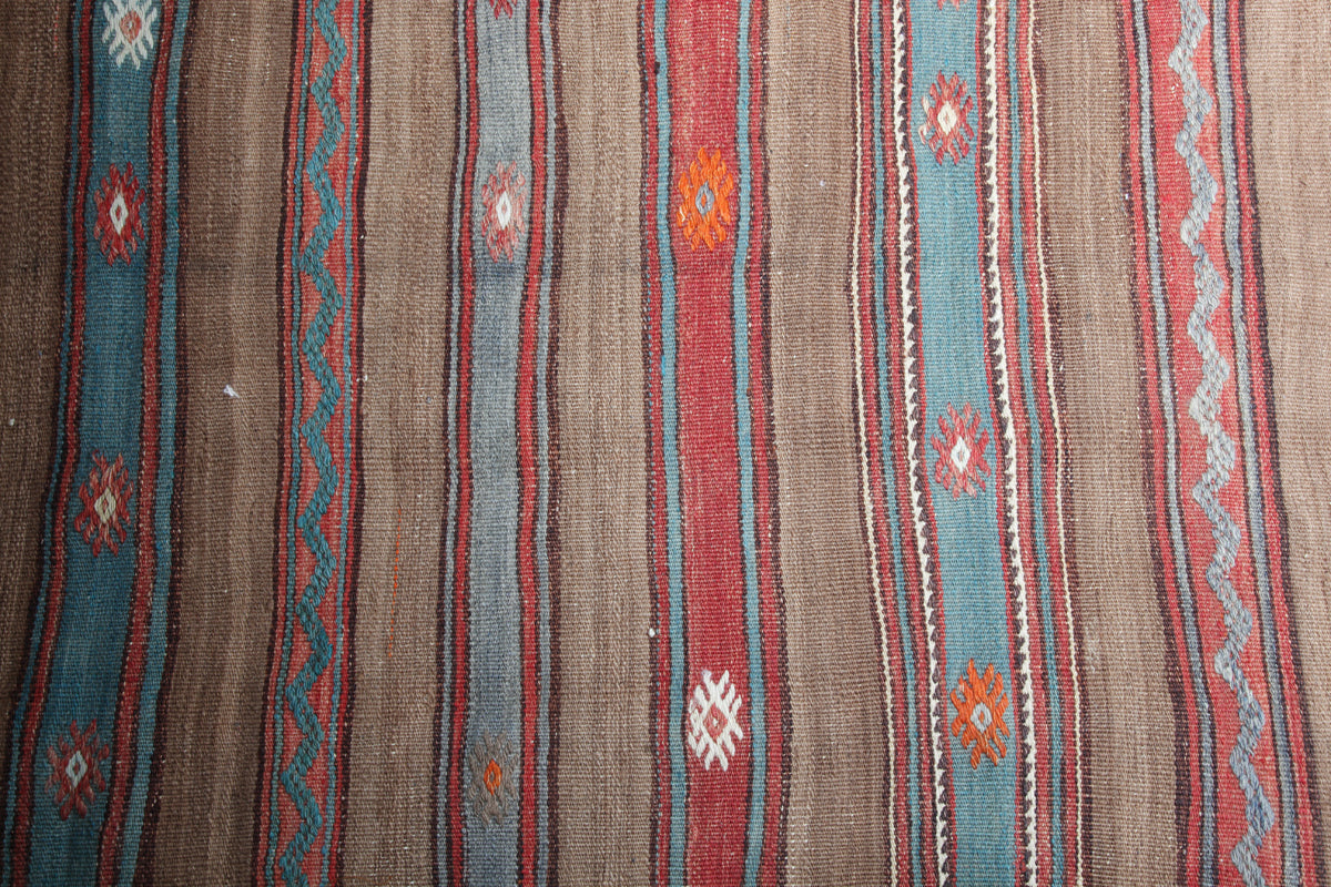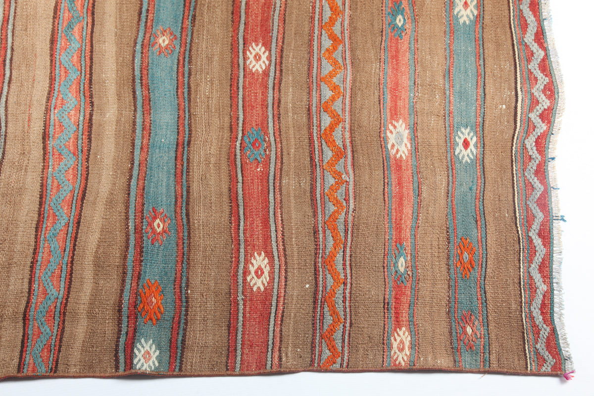 Fethiye kilims are a type of handwoven rug originating from the Balikkesir region in northwest Anatolia, Turkey. These rugs are deeply connected to the nomadic customs of the Yüncü people. The first documented Turkish kilim can be traced back to Neolithic pottery from Çatalhöyük, dating back to 7000 BC. Originally used as blankets, saddle blankets, seat mats, or wall decorations, kilims with varied purposes, such as this one, were often created with striped patterns, known as "water channel" or "essence of life."