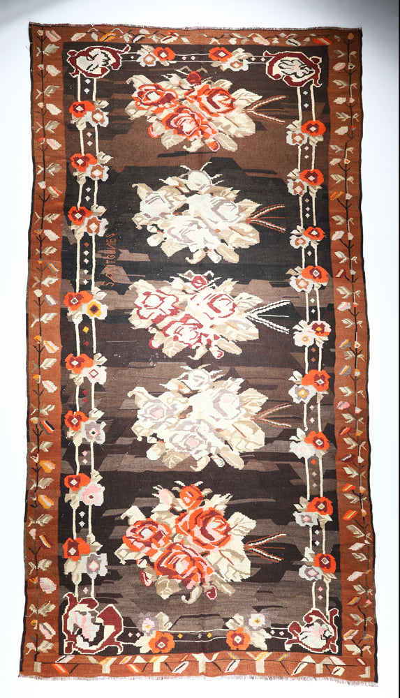 TThis exceptional Moldavian kilim features an undyed natural wool background crafted from dark sheep native to the region. The weaver’s careful selection of colors and motifs creates a striking and distinctive piece that highlights traditional craftsmanship.
