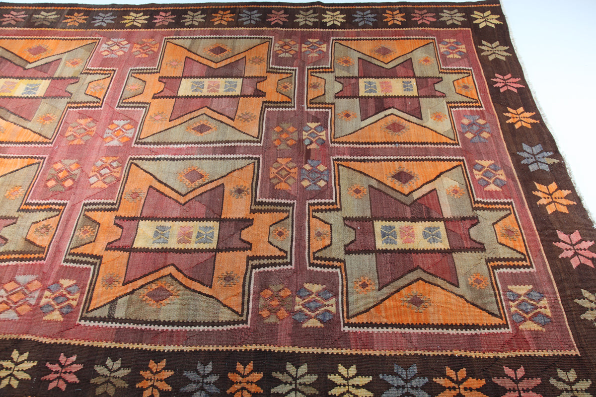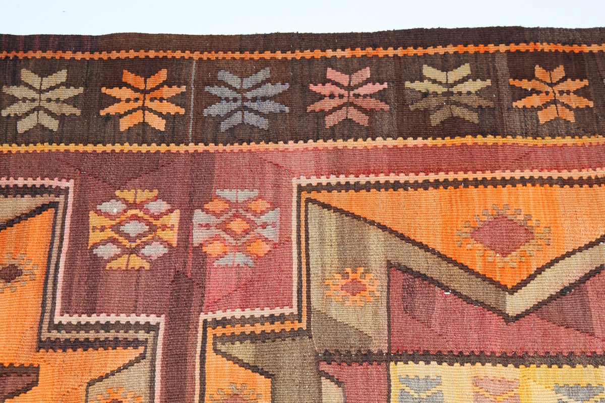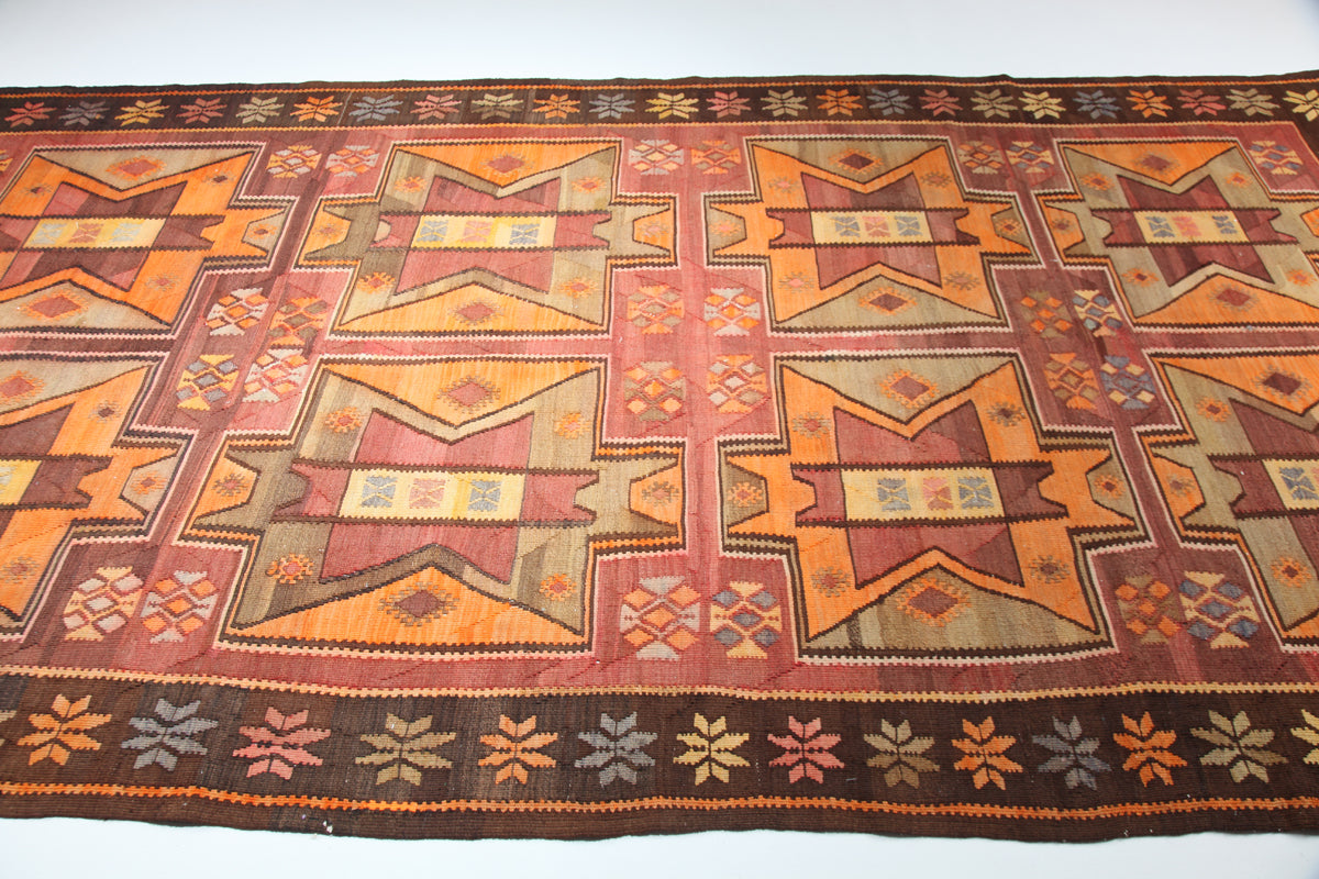 Experience the distinctive artistry of this Vintage Kars Kilim dowry chest, showcasing a captivating array of symbolic motifs deeply rooted in regional tradition. The intriguing cat ear figures symbolize curiosity and heightened awareness, while the sacred oil lamp shapes draw from ancient Shamanistic beliefs, reflecting spiritual depth and protection. Surrounding these central elements, the border features exquisite decorations of Goodnews-birds, emblematic of positive messages and blessings. The harmonious earth tone color palette enhances the piece's natural beauty, complementing the intricate designs with warmth and subtlety. This kilim stands as a remarkable example of cultural storytelling through textile art, making it a rare and valuable addition for collectors and connoisseurs who appreciate ethnographic significance alongside refined craftsmanship.