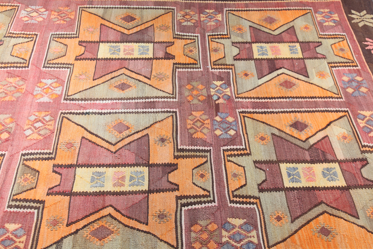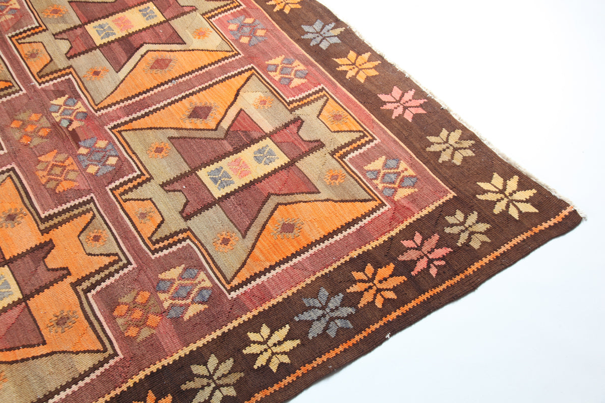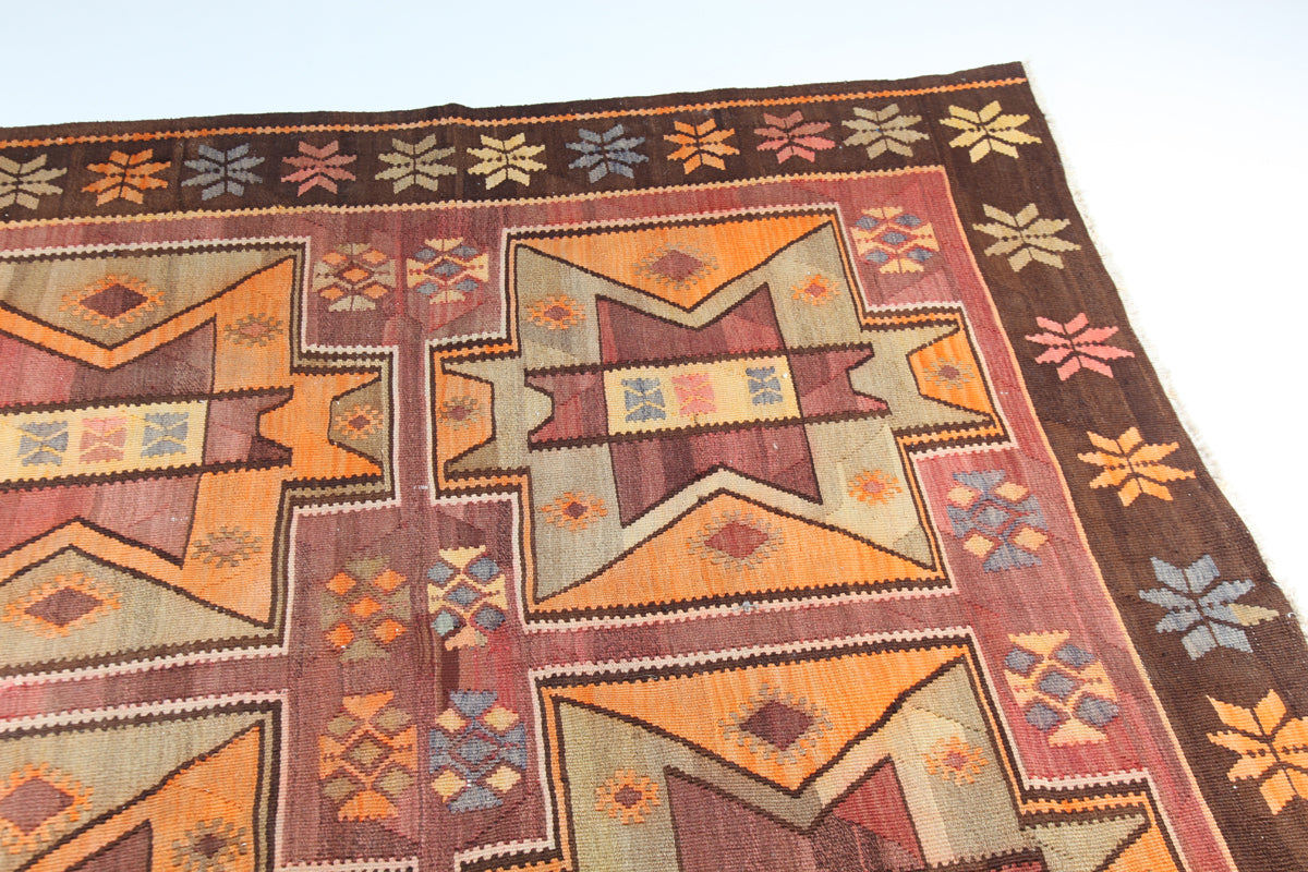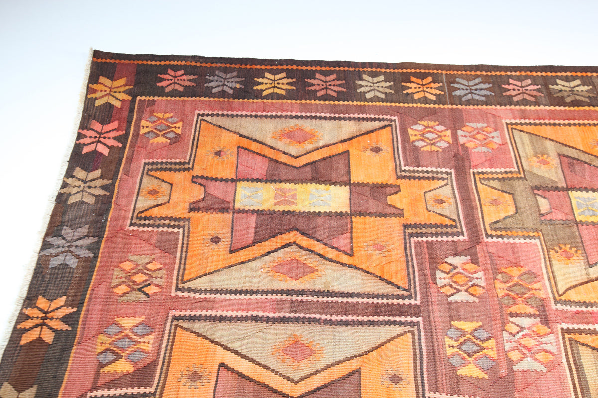 Experience the distinctive artistry of this Vintage Kars Kilim dowry chest, showcasing a captivating array of symbolic motifs deeply rooted in regional tradition. The intriguing cat ear figures symbolize curiosity and heightened awareness, while the sacred oil lamp shapes draw from ancient Shamanistic beliefs, reflecting spiritual depth and protection. Surrounding these central elements, the border features exquisite decorations of Goodnews-birds, emblematic of positive messages and blessings. The harmonious earth tone color palette enhances the piece's natural beauty, complementing the intricate designs with warmth and subtlety. This kilim stands as a remarkable example of cultural storytelling through textile art, making it a rare and valuable addition for collectors and connoisseurs who appreciate ethnographic significance alongside refined craftsmanship.