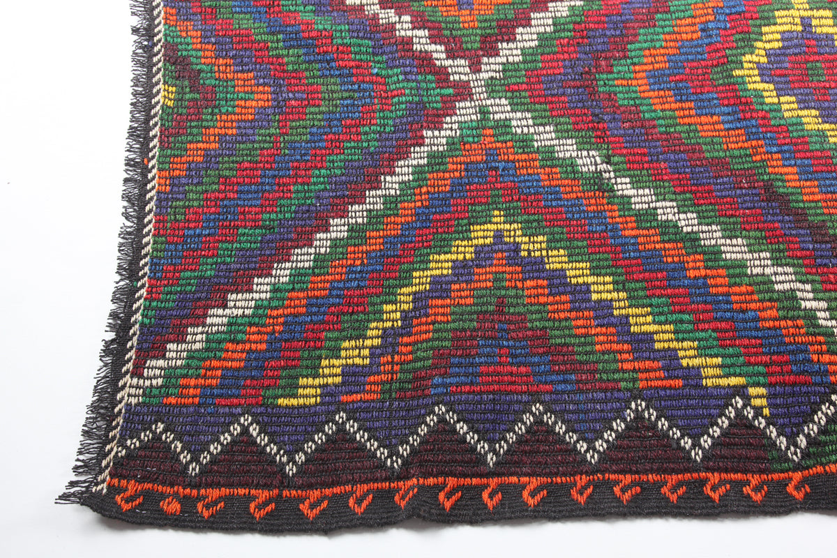 This jijim kilim from Manisa’s hinterland features an earth mother design, handwoven by local villagers as a durable floor covering. It incorporates thick, undyed mountain wool of coarse texture for the base, with patterned jijim weaving layered on top, showcasing traditional craftsmanship.