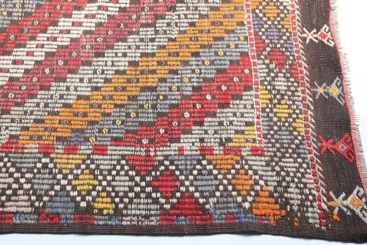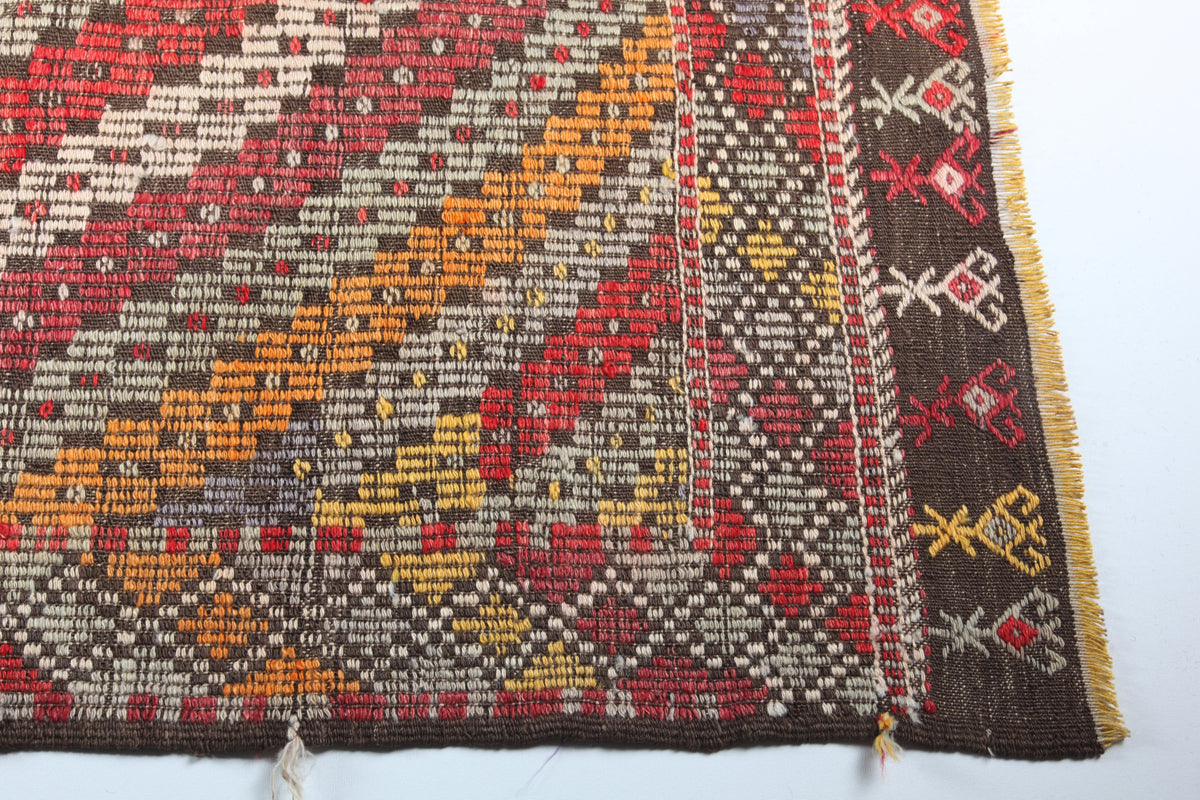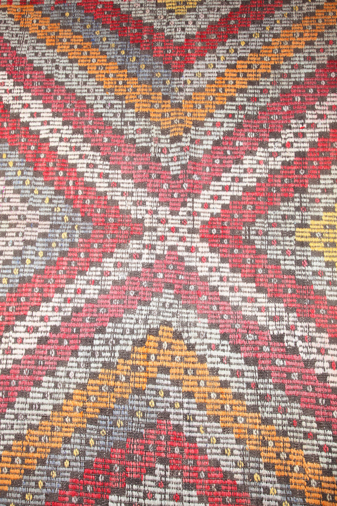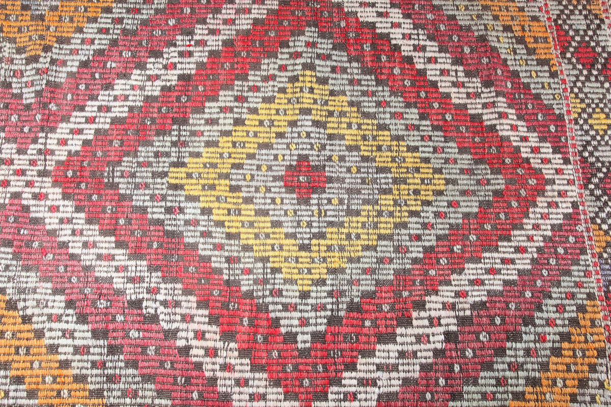 This jijim kilim from Manisa’s hinterland features an earth mother design, handwoven by local villagers as a durable floor covering. It incorporates thick, undyed mountain wool of coarse texture for the base, with patterned jijim weaving layered on top, showcasing traditional craftsmanship. This is a powerful Earth Mother designed jijim kilim.