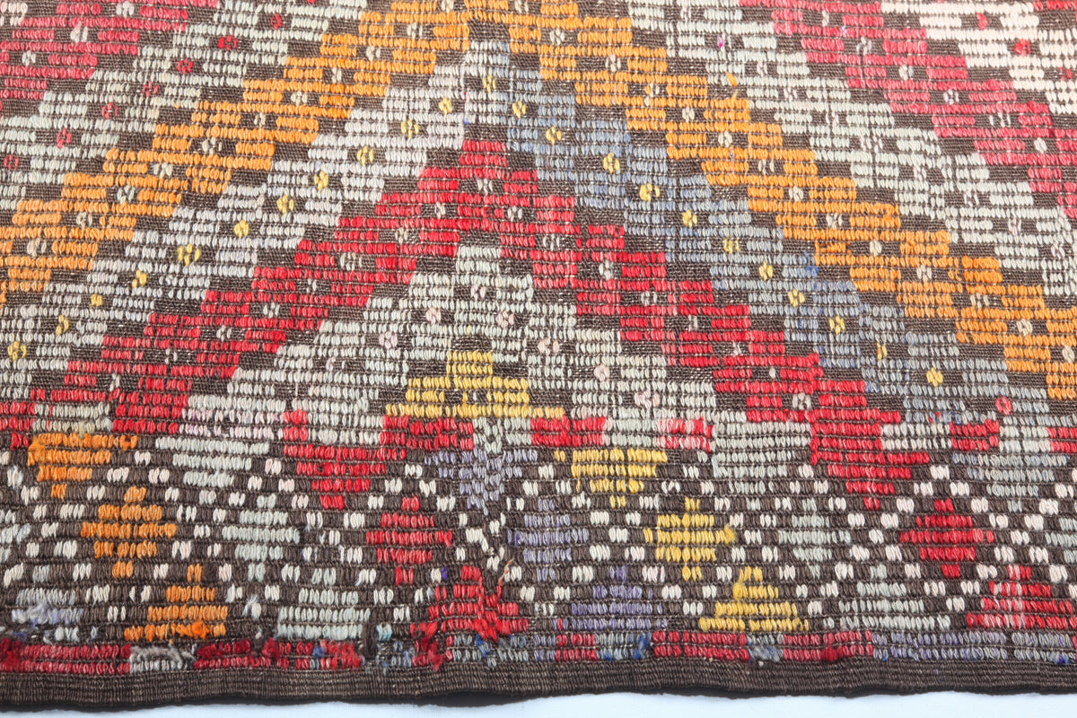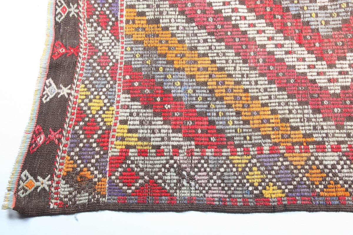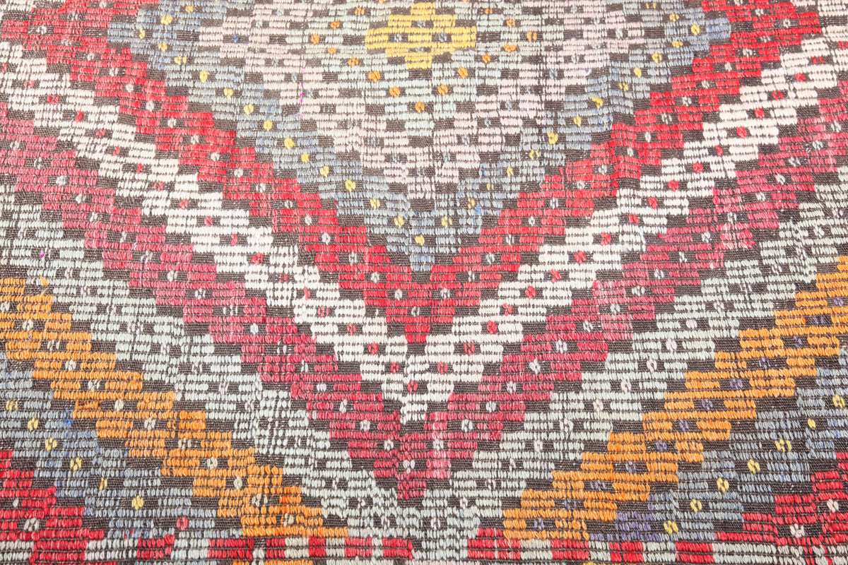 This jijim kilim from Manisa’s hinterland features an earth mother design, handwoven by local villagers as a durable floor covering. It incorporates thick, undyed mountain wool of coarse texture for the base, with patterned jijim weaving layered on top, showcasing traditional craftsmanship. This is a powerful Earth Mother designed jijim kilim.