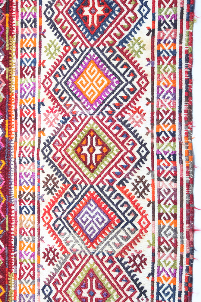 Most of our tribal rugs like this 3 panel Sivas jjim kilim were woven in either Turkiye or Central Asia where the Turkic people lived. The motives are very clear against their backgrounds. This combination of artistry and symbolism not only highlights the weaver’s technical mastery but also offers a tangible connection to the region’s ancient spiritual heritage.