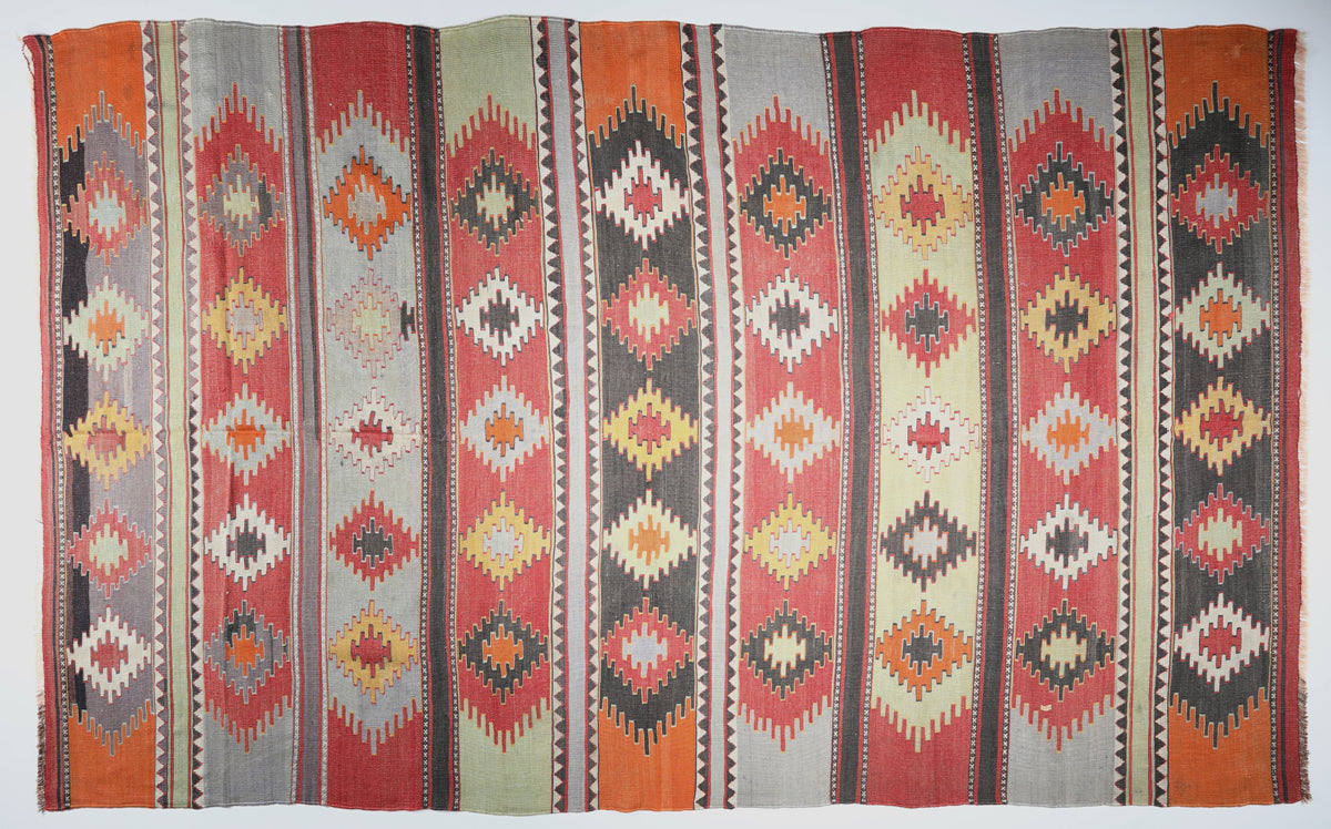 This piece is a Dazkiri-style kilim, linked to early Dazkiri nomads who settled in this region during the 15th-16th centuries before many migrated west toward the Aegean coast. It reflects the heritage of those who remained, often featuring Anatolian goddess motifs symbolizing the protective all-seeing eye, alongside sacred oil lamp imagery. The earliest recorded Turkish kilim can be traced to Neolithic wall paintings from Çatalhöyük, dating back to 7000 BC. Originally serving as blankets, saddle covers, seat mats, or wall hangings, kilims like this one frequently incorporate striped designs known as "water channel" or the "essence of life."